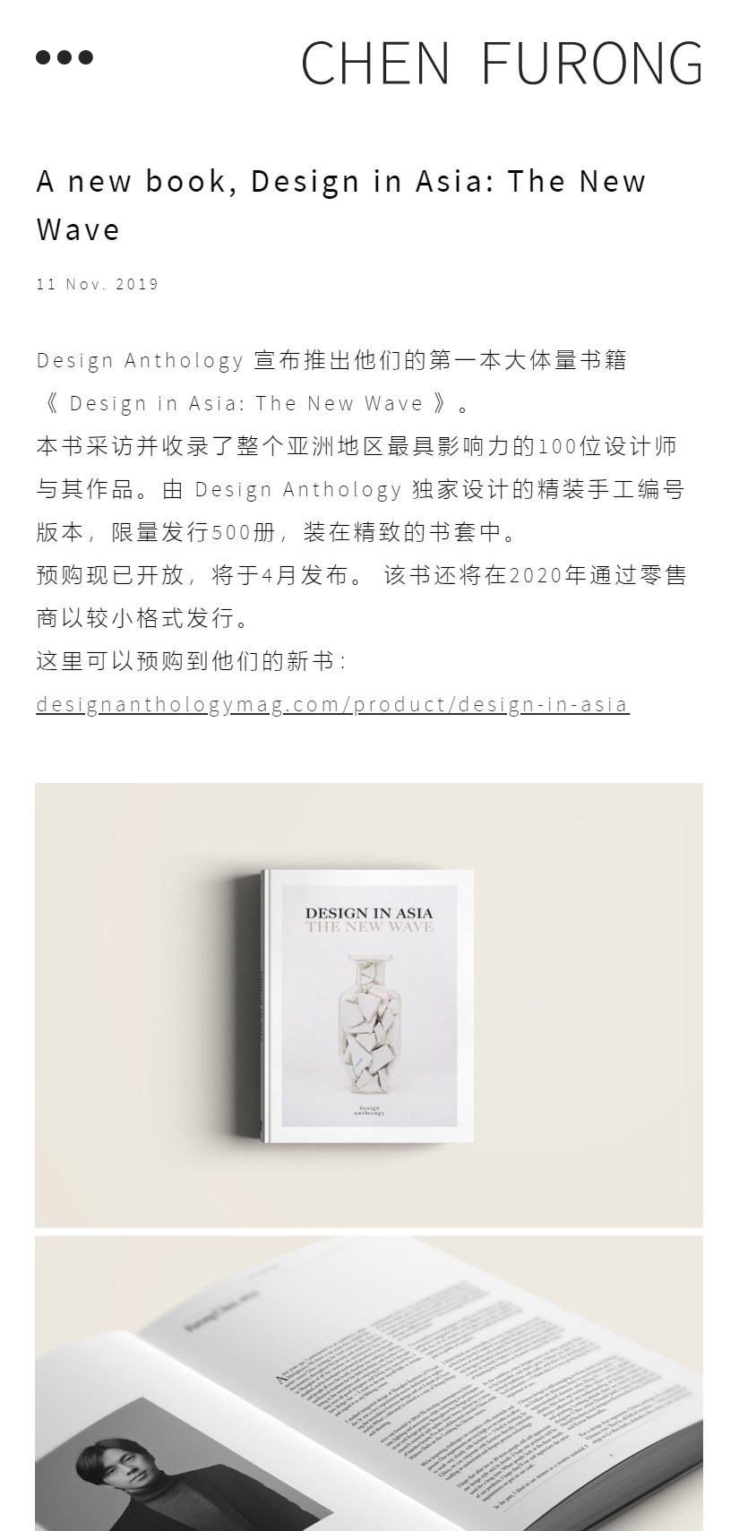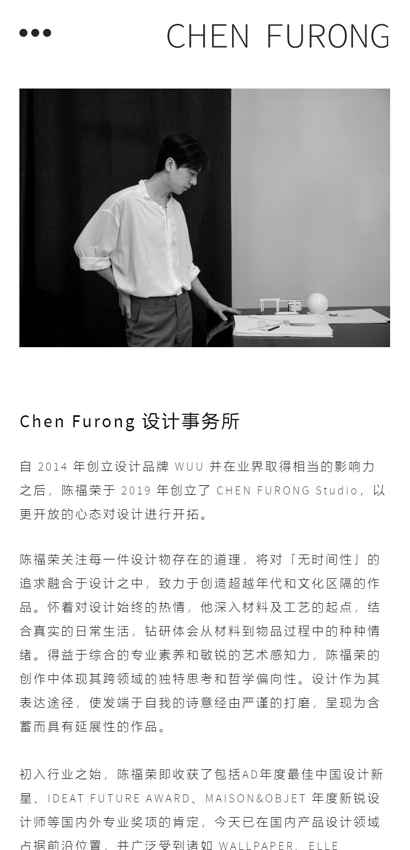 初入行业之始,陈福荣即收获了包括AD年度最佳中国设计新星、IDEAT FUTURE AWARD、MAISON&OBJET 年度新锐设计师等国内外专业奖项的肯定,今天已在国内产品设计领域占据前沿位置,并广泛受到诸如 WALLPAPER、ELLE DECO、AD、IDEAT、INTERNI、VOGUE、ICON 等国际专业设计媒体的深入报道。