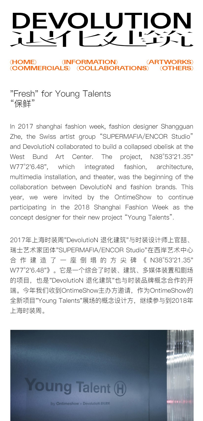 "DEVOLUTION 退化建筑" 成立于2016年,由汤建松、王琦、杨鹿童三名成员组成。是一家致力于提供 "建筑 Architecture、艺术 Art、广告创意 Advertisement" 综合方案的"3A公司"。同时,"DEVOLUTION 退化建筑" 也尝试将建筑与不同媒介对接,输出城市和建筑观点的开放创作机构,希望用建筑思维和艺术生产的方式,在不同环境中肇事。