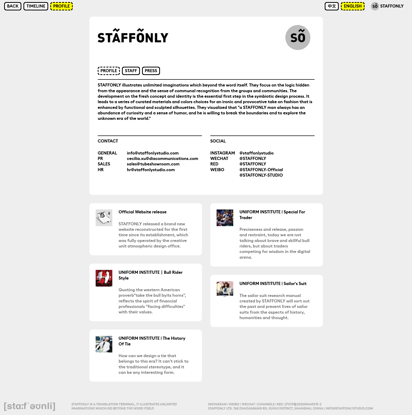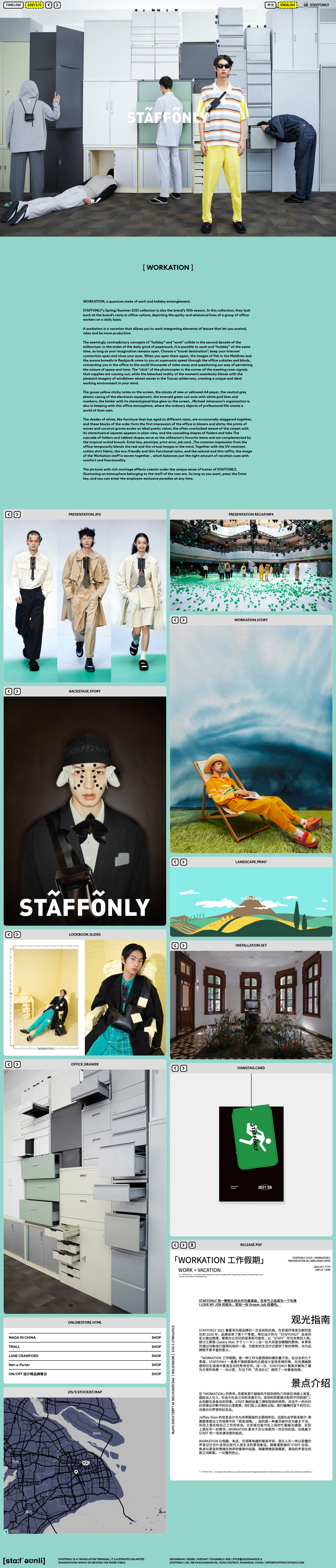STAFFONLY illustrates unlimited imaginations which beyond the word itself. They focus on the logic hidden from the appearance and the sense of communal recognition from the groups and communities. The development on the fresh concept and identity is the essential first step in the symbiotic design process. It leads to a series of curated materials and colors choices for an ironic and provocative take on fashion that is enhanced by functional and sculpted silhouettes. They visualized that "a STAFFONLY man always has an abundance of curiosity and a sense of humor, and he is willing to break the boundaries and to explore the unknown era of the world."
