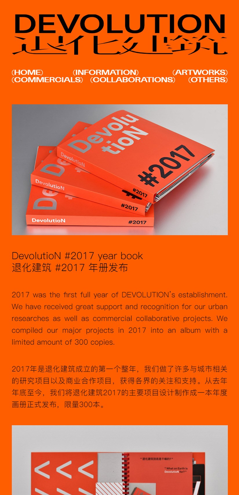 "DEVOLUTION", established in 2016 by Tang Jiansong, Wang Qi and Yang Lutong, is a "3A company" dedicated to providing comprehensive plans of Architecture, Art and advertisement. "DEVOLUTION" is also an open and creative studio that inspires to connect architecture with various media, produces new ideas on architecture and urban living, and hopes to bring architectural thinking and artistic approaches into different areas.